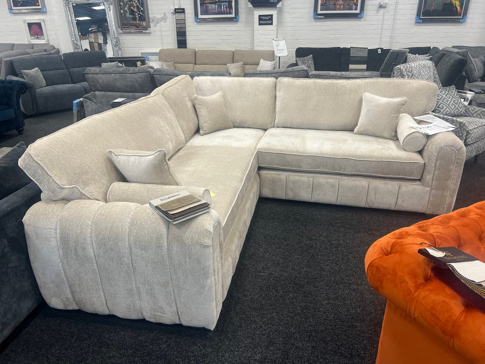 This Stunning Sofa is part of our SOFAS BY YOU Range this sofa can be customised with different fabrics & can also be made to size this sofa comes as standard size 260cm by 260cm if you would like to view this stunning u shape sofa & see our different fabric options please visit our Showroom at – 75 Barrie Road G52-4PX , Hillington